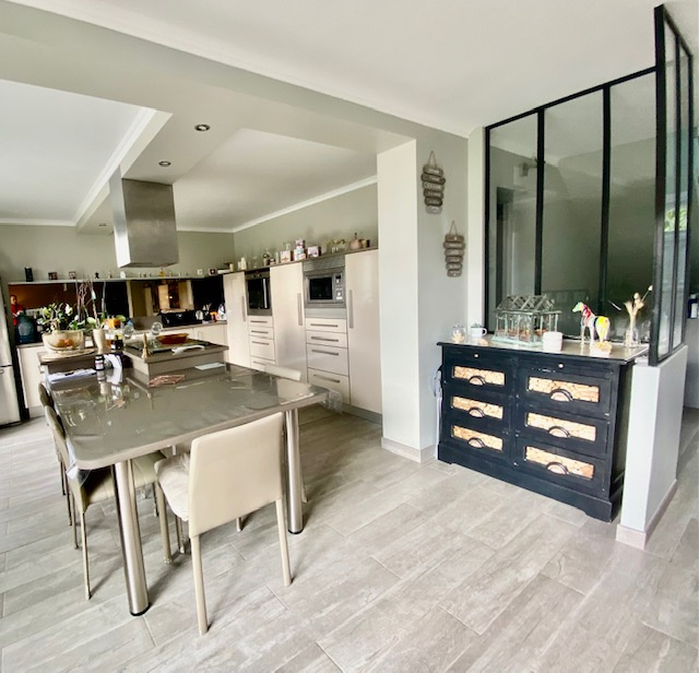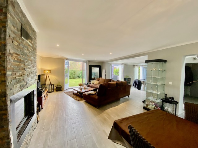 AU RDC ; d’une entrée cathédrale, d’un double séjour traversant avec insert, d’une cuisine américaine familiale aménagée et équipée.