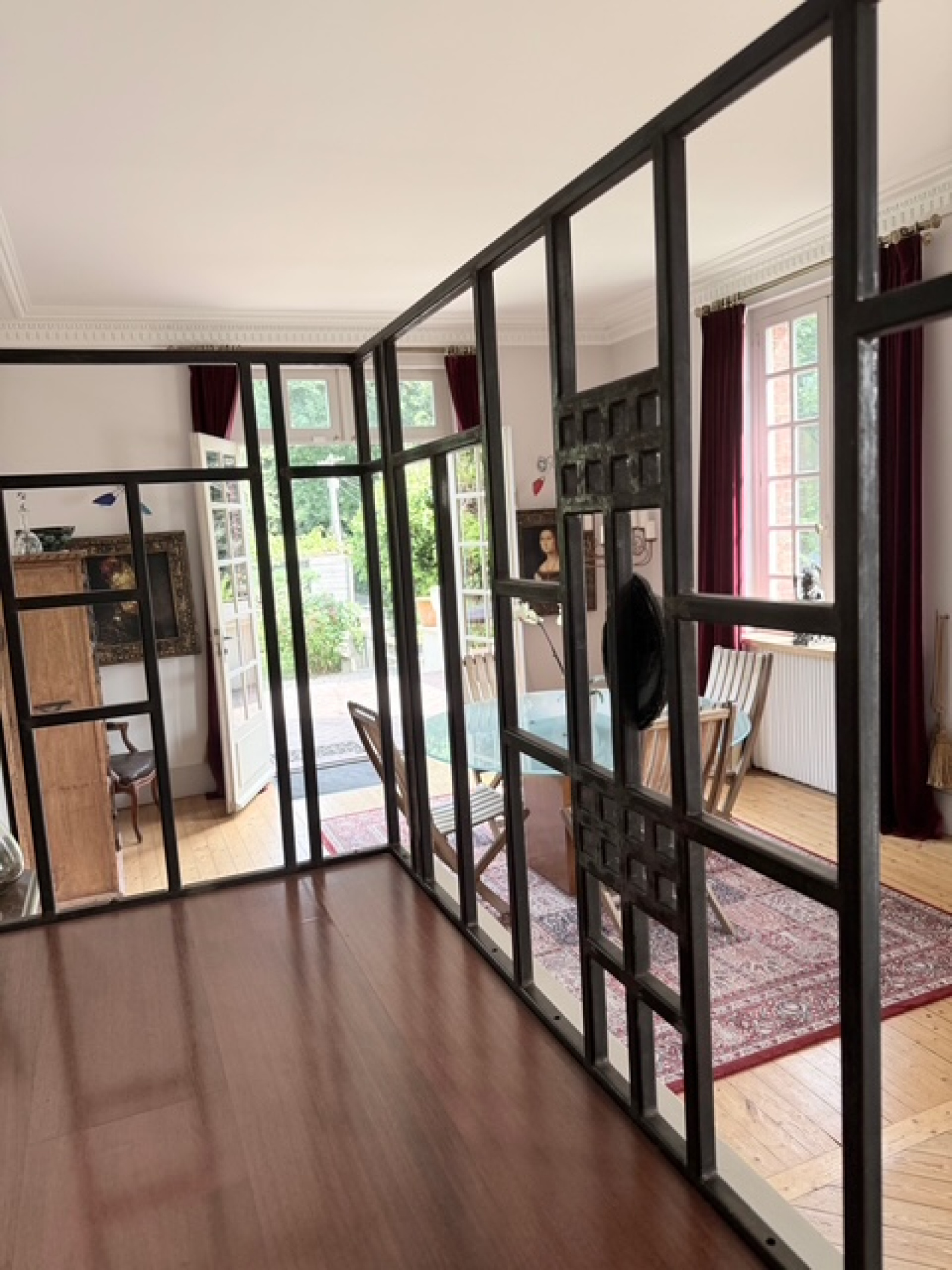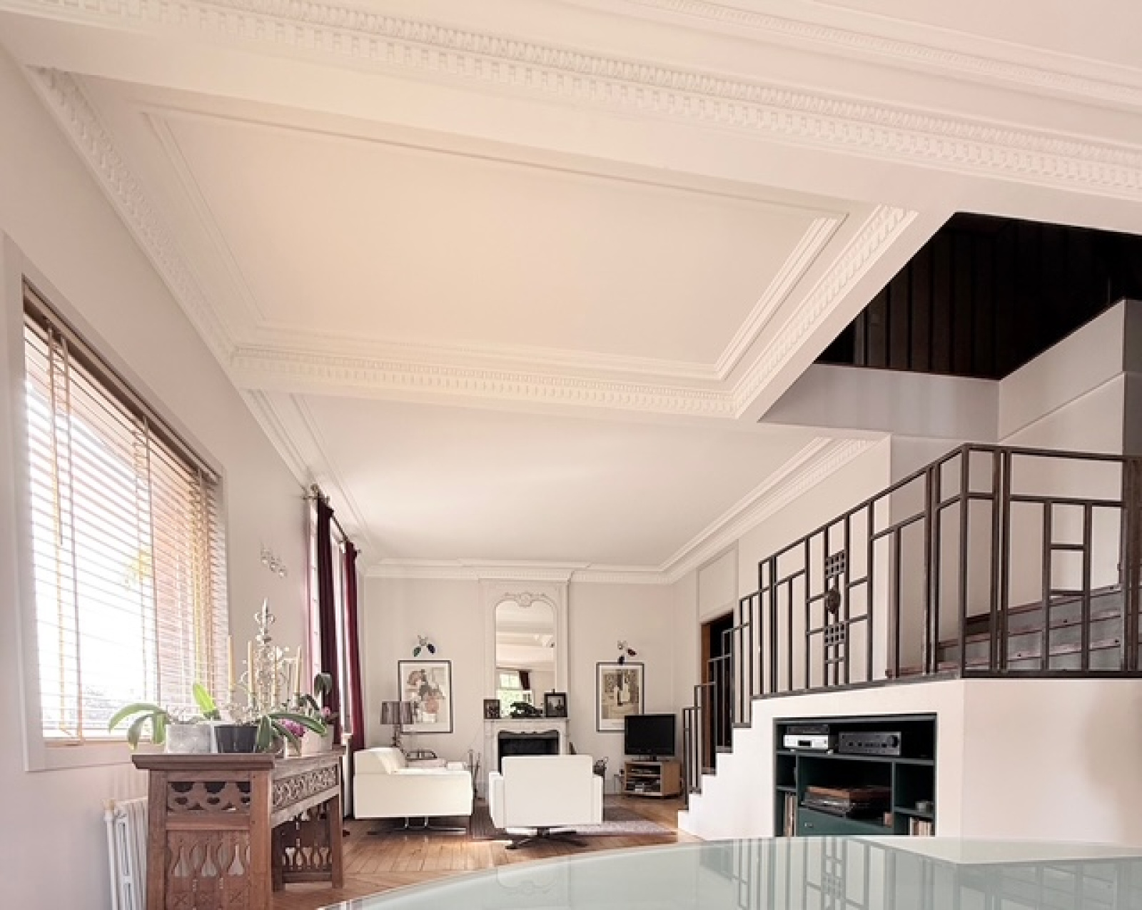 Le parquet, les moulures et la belle hauteur sous plafond confèrent à l’espace une ambiance conviviale et authentique.