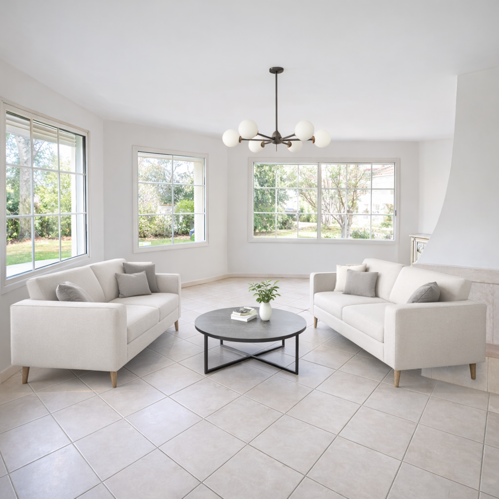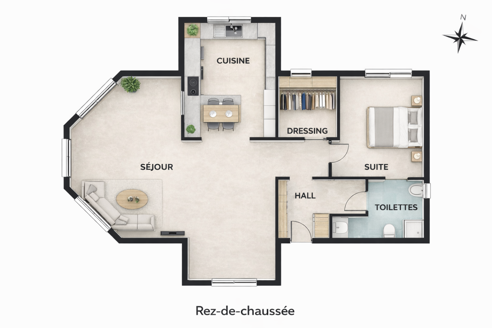 Dès l’entrée, la maison séduit par ses volumes et sa lumière naturelle. Le séjour et la salle à manger, d’une surface d’environ 52 m², sont sublimés par un bow-window qui ouvre la perspective sur le jardin.