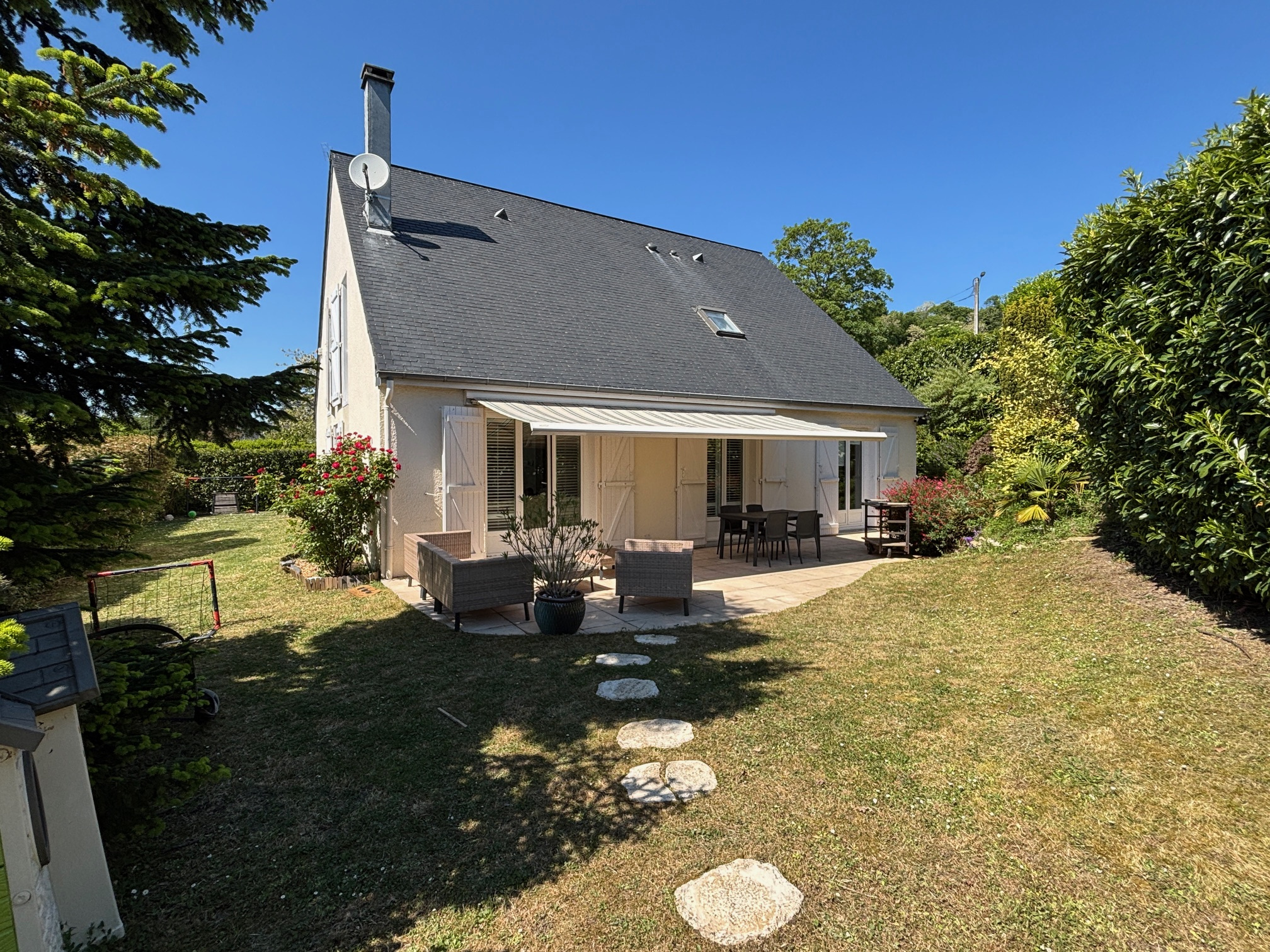 Cette maison familiale d’environ 143 m² située dans un parc arboré est composée de 5/6 pièces dont 4 chambres.