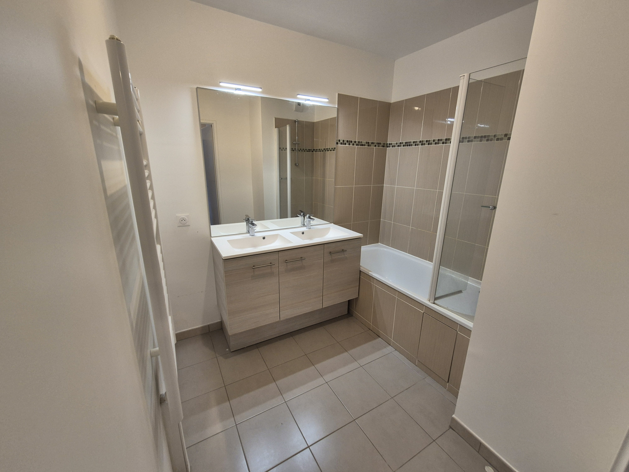 L'appartement est composé d'une pièce principale avec cuisine ouverte et son ilot central avec rangements, d'une terasse, de deux chambres, d'une salle de bain avec double vasques et baignoire ainsi qu'un WC séparé.